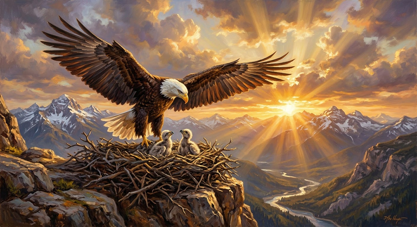 Hereβs my quick take. God is the Eagle. The nest is this globe where we liveβyour little world and mine. Godβs stirring is life itselfβwhatever it brings our way. And it is ALL meant as training. Not just skills for getting by, not just coping with hard thingsβbut the formation of character. And hereβs what stops me cold: that character formation doesnβt clock out when this life ends. Weβre being shaped for something beyond this world, too. The small moments arenβt small at all.